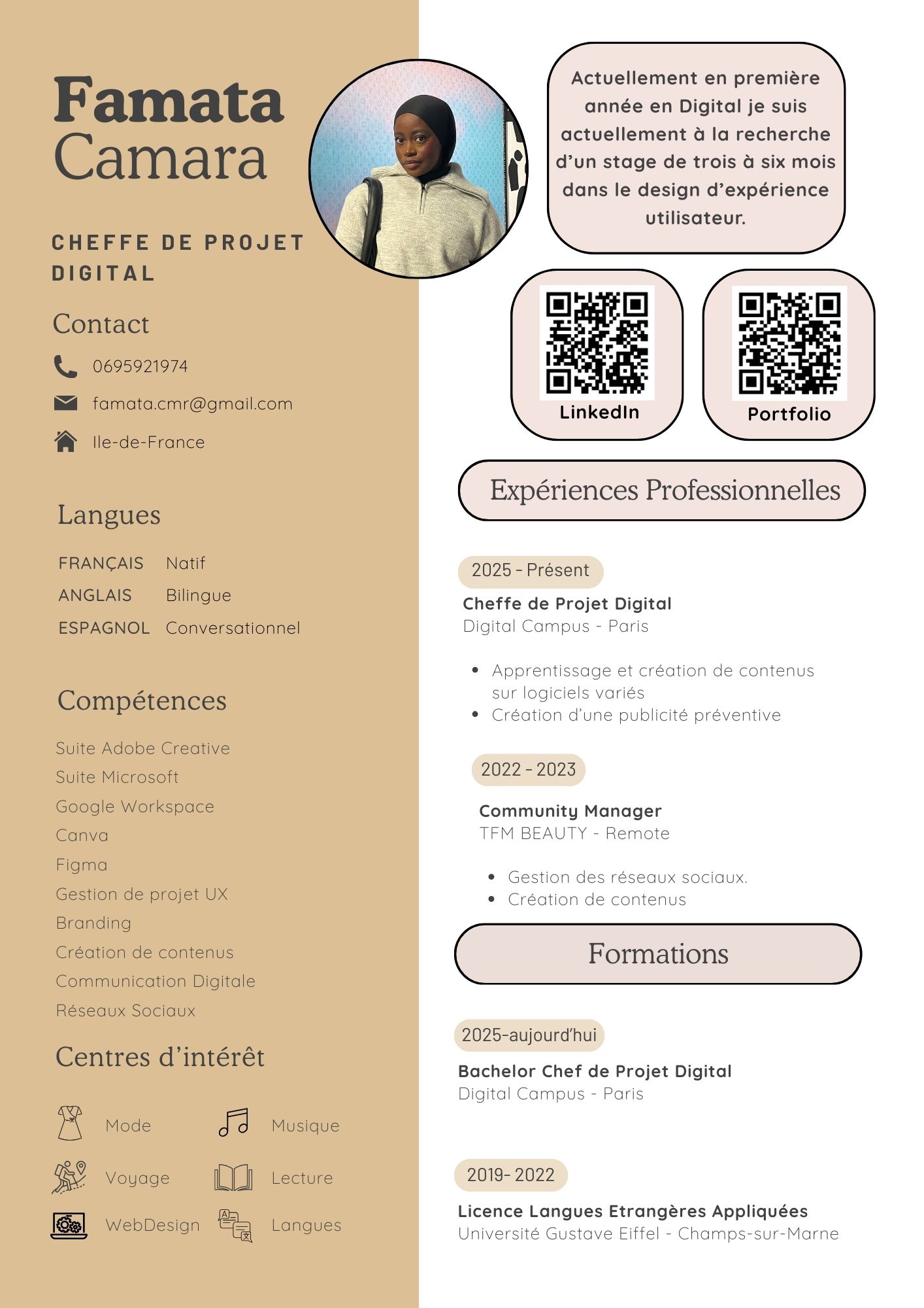 Je suis actuellement à la recherche d’un stage pour février 2026 et d’une alternance pour septembre 2026 dans l’UX. Je suis prête à relever chaque défi afin d’en apprendre davantage et de mettre mes connaissances à profit !