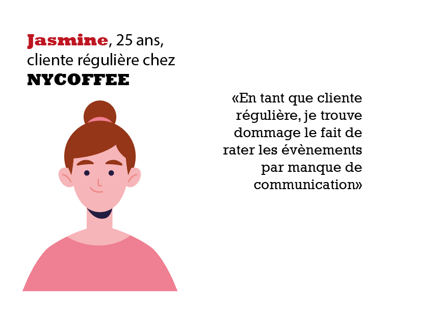 A partir de la marque, j’ai imaginé un cas d’expérience utilisateur exprimant les frustrations d’une cliente quant au fait de rater les événements organisés par le coffee shop.