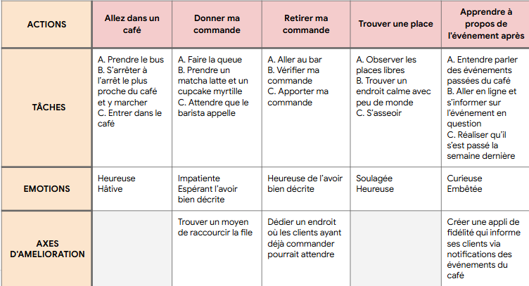 Après avoir imaginé le User Persona et sa User Story, j’ai imaginé en suite tout le processus de son parcours en tant qu’utilisateur. Il retrace ses actions de sa visite au café à la réalisation d’avoir raté un énième évènement.